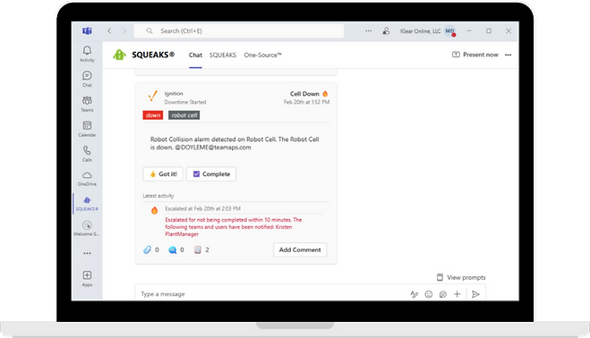 that are easy to configure and share. By connecting Ignition to SQUEAKS, manufacturers gain instant visibility into factory performance—right within SQUEAKS and Microsoft Teams.